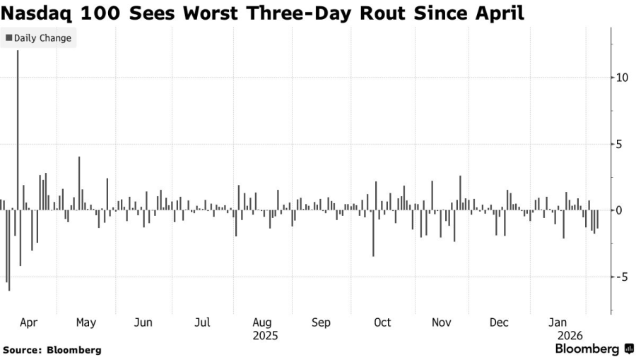 Тоа повторно јасно се виде во четвртокот, кога S&P 500 падна за 1,2 отсто, трет последователен дневен пад, а Nasdaq 100 го продлабочи најголемиот пад од април наваму. Акциите на софтверските компании го продолжија падот откако стартапот за вештачка интелигенција „Антропик“ (Anthropic) претстави нов модел наменет за спроведување финансиски истражувања, вторпат оваа недела компанијата ги вознемири пазарите, нагласувајќи ја конкурентската закана од новата технологија.