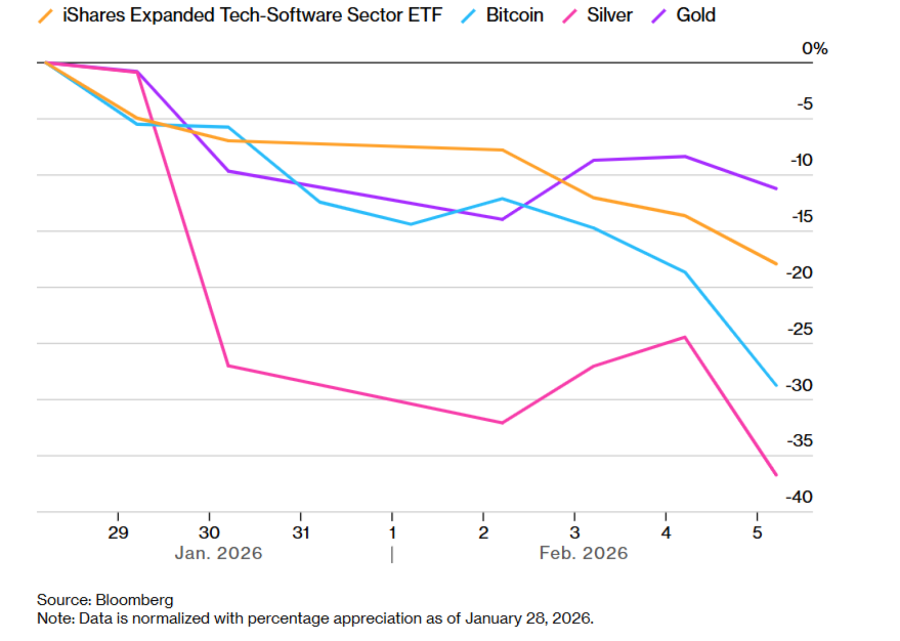 Среброто, кое редовно го следеше златото до рекордни нивоа, се урна за 20 отсто. Биткоинот падна за повеќе од 13 отсто, бришејќи ги сите добивки остварени од изборот на Трамп пред 15 месеци, додека инвеститорите се справуваа со тргувањата со загуби финансирани со позајмени пари. Американските државни обврзници пораснаа, повторно преземајќи ја својата вообичаена улога на засолниште во крајна нужда. А по затворањето на берзите, „Амазон“ (Amazon.com Inc.) потона за повеќе од 11 отсто откако соопшти дека годинава планира да инвестира 200 милијарди долари, далеку повеќе од процените на аналитичарите, кои сè повеќе се загрижени дека технолошките компании претерано трошат на ВИ.