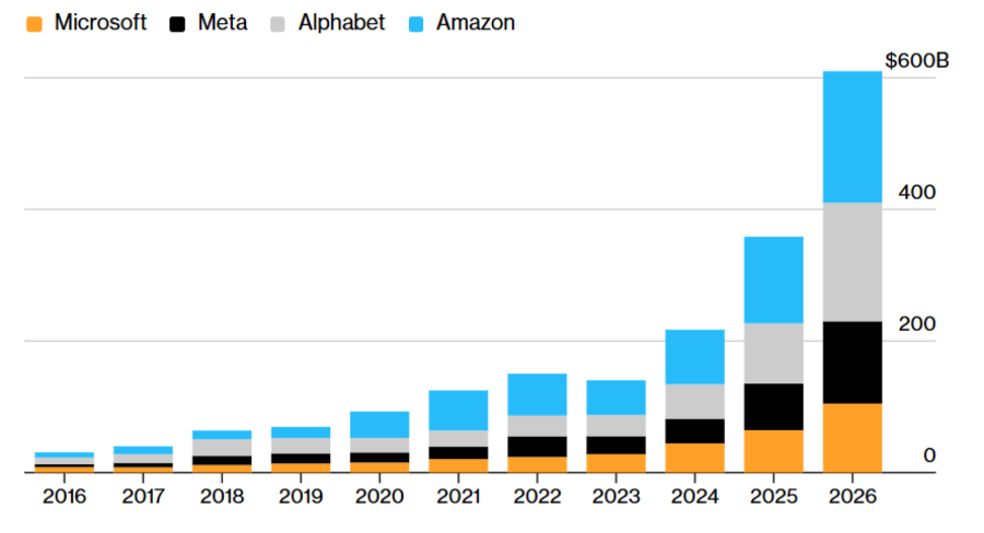 Четири од најголемите американски технолошки компании заедно прогнозираат капитални расходи што ќе достигнат околу 650 милијарди долари во 2026 година, зачудувачки бран готовина наменет за нови центри за податоци и целата опрема што тие ја содржат. Планираните инвестиции на „Алфабет“ (Alphabet Inc.), „Амазон“ (Amazon), „Мета“ (Meta Platforms Inc.) и „Мајкрософт“ (Microsoft Corp.) претставуваат инвестициски бум без преседан во овој век.