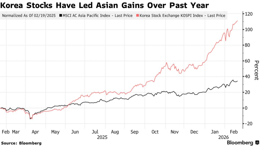Азиските акции пораснаа за 0,6 проценти откако показателите на Волстрит добија поттик од технологијата. Јужна Кореја - симбол на инвестициите во вештачката интелигенција - скокна за 3 проценти на рекордно ниво по враќањето од празниците за Лунарната Нова Година, а „Самсунг електроникс“ (Samsung Electronics Co) исто така достигна рекордно високо ниво. Фјучерсите на индексот на акции покажаа добивки за американските акции и рамен почеток за Европа.