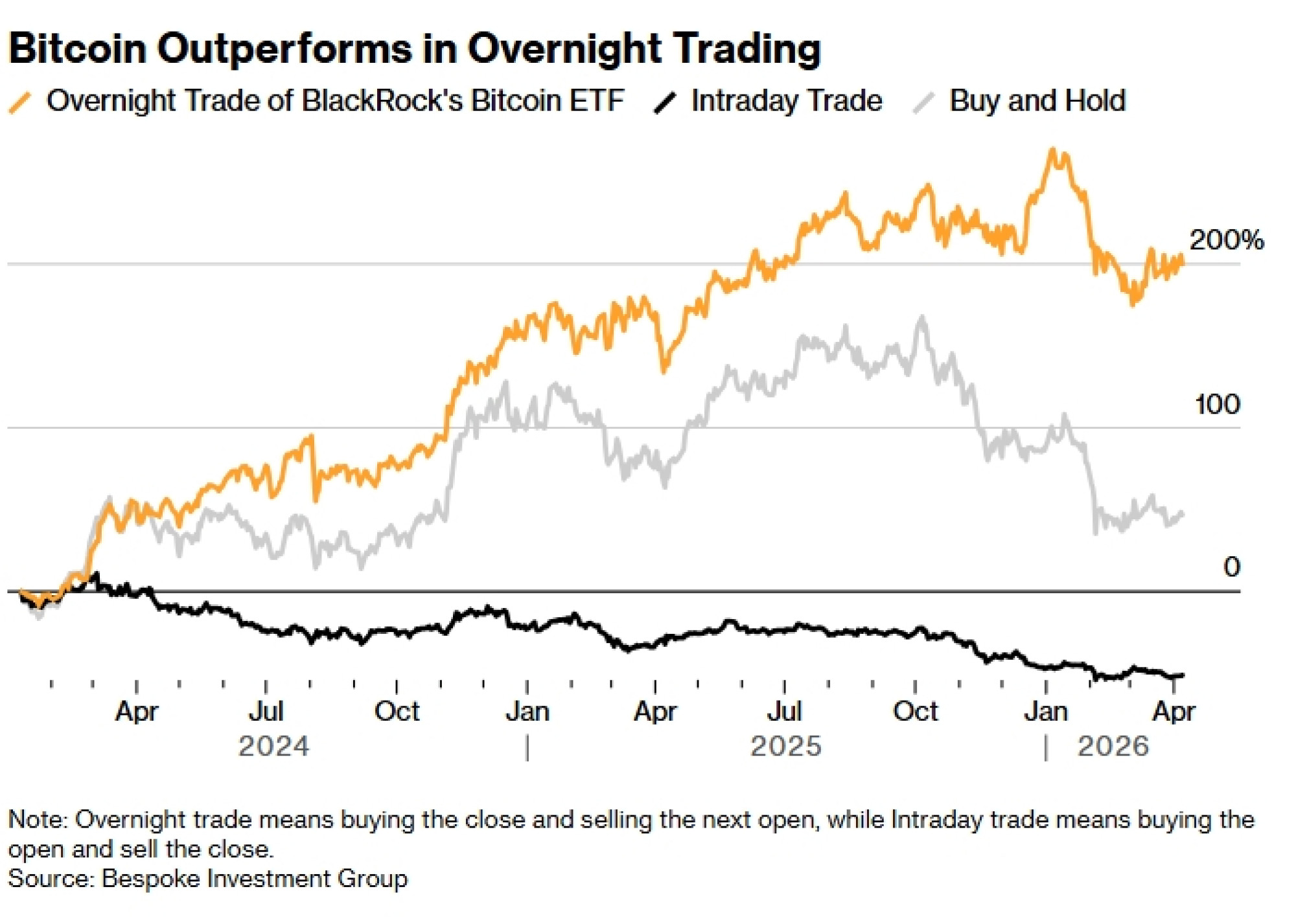 Откако беше лансиран биткоин ЕТФ на „Блекрок“ (BlackRock), iShares Bitcoin Trust (тикер: IBIT) во јануари 2024 година, аналитичарите открија значителни ценовни разлики помеѓу затворањето на пазарот и неговото отворање. Податоците на БИГ (Bespoke Investment Group) покажуваат дека овие „ноќни празнини“ донеле приближно 200 отсто добивка, што го надминува растот на традиционалната стратегија за купување и држење биткоин, која за истото време остварила раст од повеќе од 40 отсто. Наспроти тоа, стратегијата за купување на отворање и продавање на затворање предизвикала губитоци од повеќе од 50 отсто.