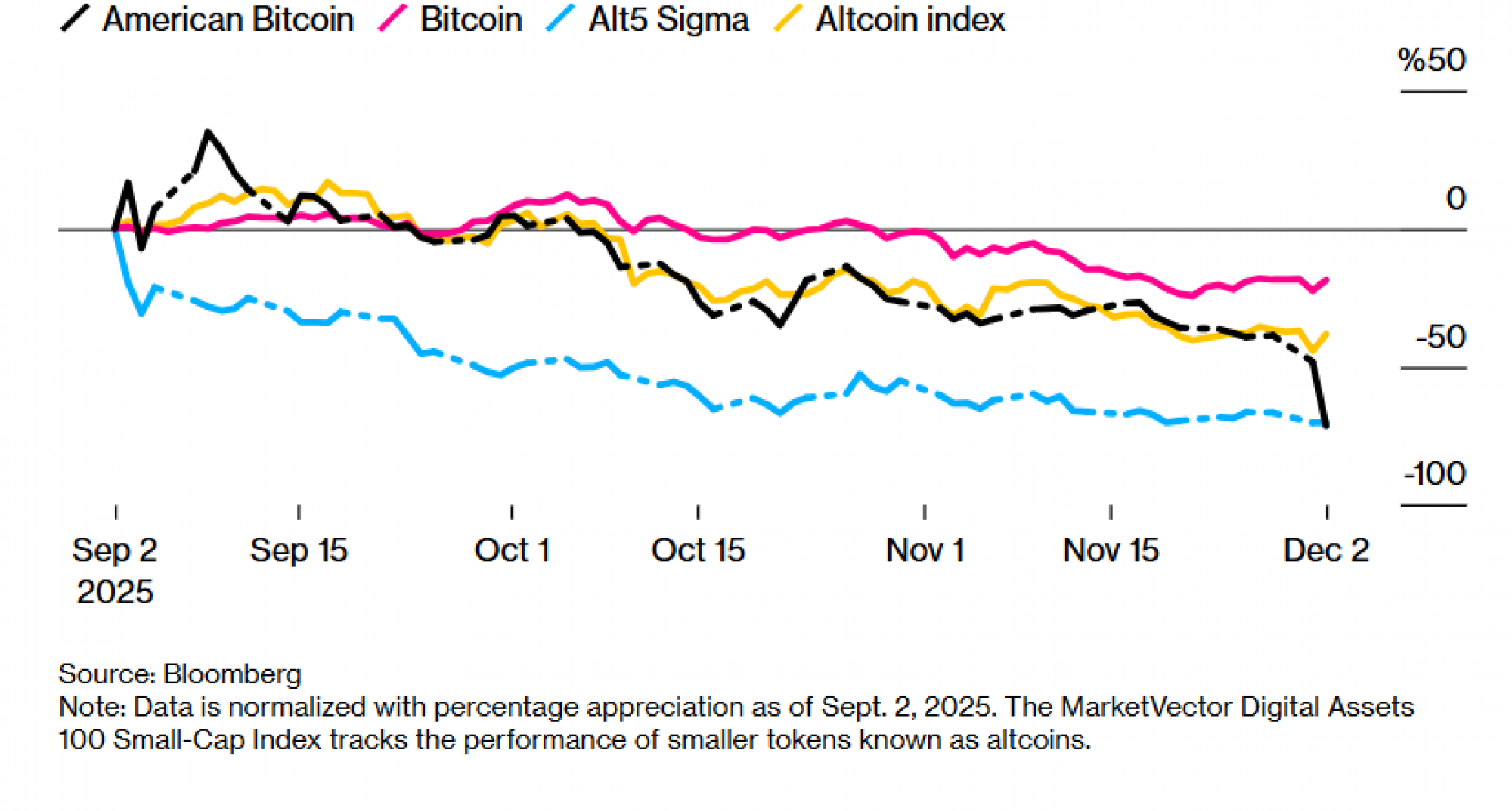 „Ворлд либерти“ (World Liberty Financial), чиј коосновач е претседателот Доналд Трамп заедно со неговите синови, забележа пад од 51 отсто кај токенот ВЛФИ (WLFI) во однос на максимумот од почетокот на септември, што е многу поголем отколку кај Биткоин и кај индексот на помалите дигитални токени. Истовремено, „Алт5 Сигма“ (Alt5 Sigma), компанијата што ја промовираат синовите на Трамп, се соочува со пад од околу 75 отсто, придружен со сè повеќе правни проблеми.