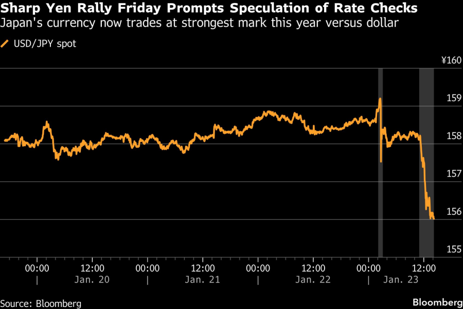 Шпекулациите за интервенција растат откако трговците пријавија за време на петочната трговска сесија во САД дека Федералната резервна банка на Њујорк контактирала финансиски институции за да праша за девизниот курс на јенот. Главниот јапонски валутен офицер претходно тој ден одби да коментира дали е спроведена проверка на курсот од нивна страна.