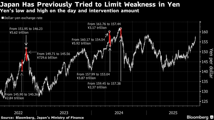 Јапонската влада потроши речиси 100 милијарди долари на купување јен за да ја поддржи валутата во 2024 година. На секоја од четирите прилики курсот на јенот беше околу 160 за долар, поставувајќи го тоа ниво како груб маркер каде што повторно би можела да се случи акција.