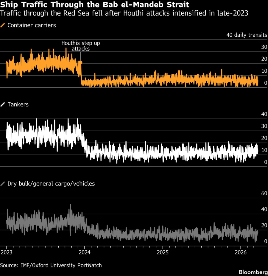 Транзитите низ Црвеното Море исто така носат повисоки трошоци отколку порано поради зголемени премии за осигурување. Сепак, тоа останува значаен канал за транспорт на нафта, гас и други стоки на танкери и товарни бродови. Во просек околу 75 пловила го минувале теснецот дневно во 2023, според податоци на ММФ-Оксфорд. Во 2025, просечниот дневен сообраќај изнесувал околу 33.