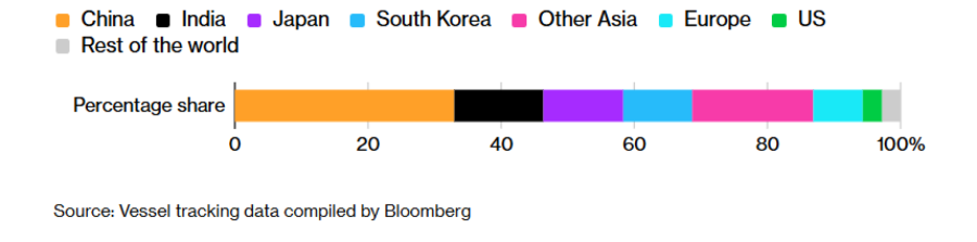 Азија прима најголем дел од нафтата транспортирана преку Ормускиот теснец