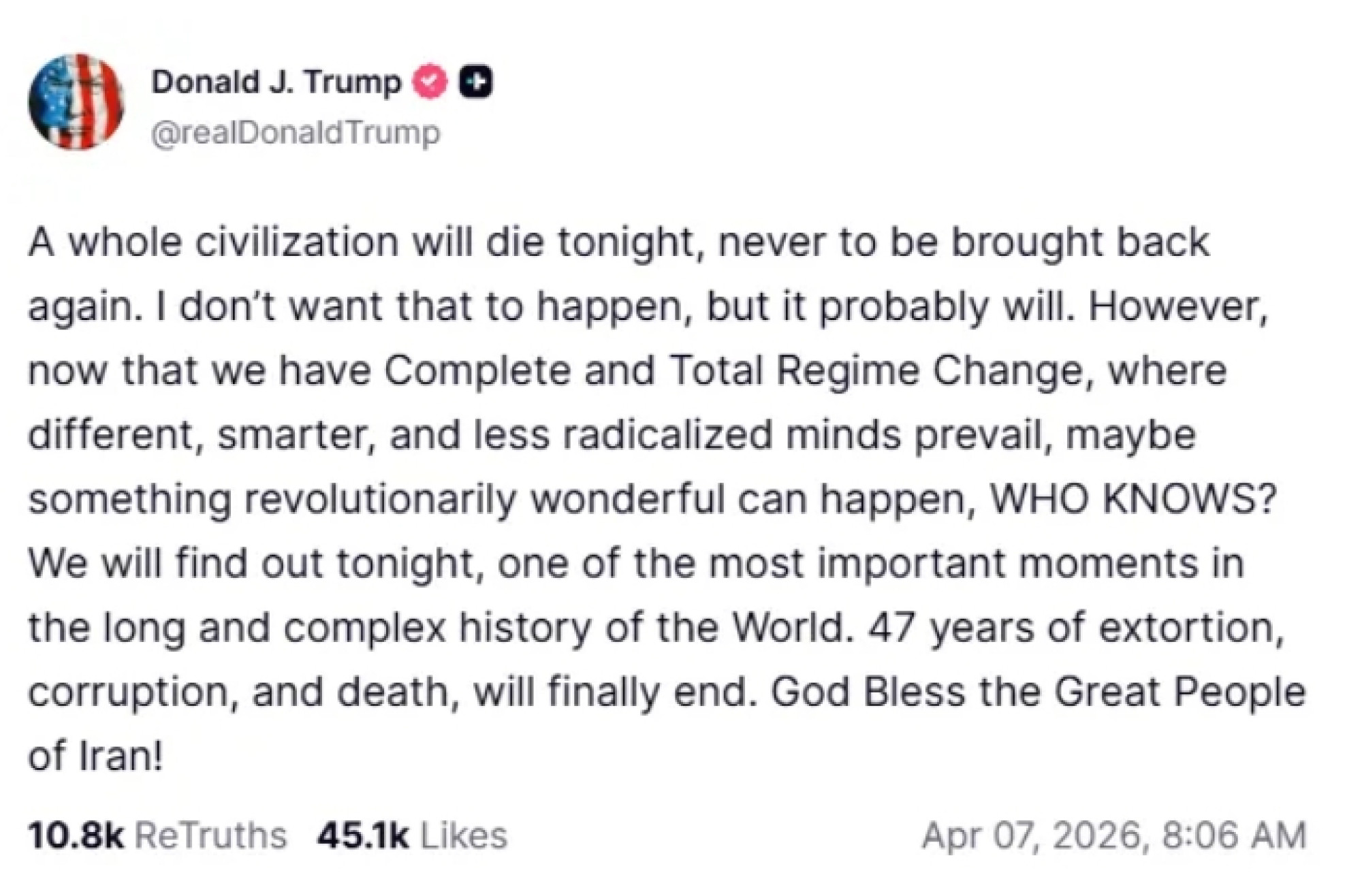 Ова беа 24 бурни часа за аналите на војната и мирот. Во САД започнаа со тоа што водачот на слободниот свет се закани со извршување на геноцид. Еве што претседателот Доналд Трамп објави на социјалната мрежа Трут (Truth Social) рано во вторникот: