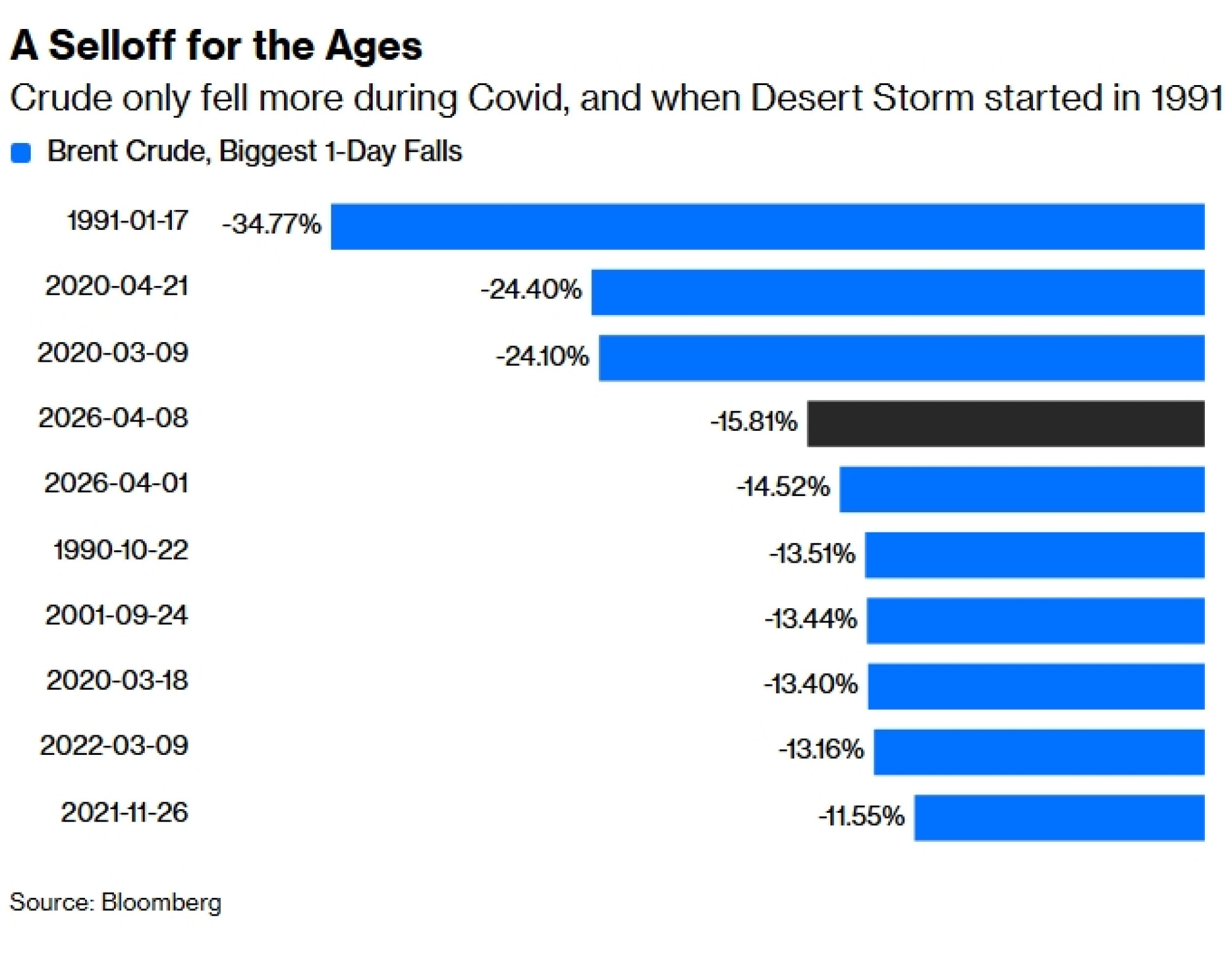 Гледано подалеку во минатото, пазарот ова го оценува како навистина историски развој на настаните. Ова се 10-те најголеми дневни падови на договорите за Брент нафта од 1990 година.