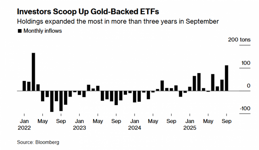 Златото скокна за повеќе од 47 отсто оваа година, ставајќи го на пат кон најголемиот годишен раст од 1979 година. Растот беше поддржан од купувањето од страна на централните банки и зголемените вложувања во берзански фондови поддржани со злато, додека Федералните резерви повторно започнаа со намалување на каматните стапки. Според податоците на „Блумберг“, септемвриските приливи во овие фондови беа најголеми во последните три години.