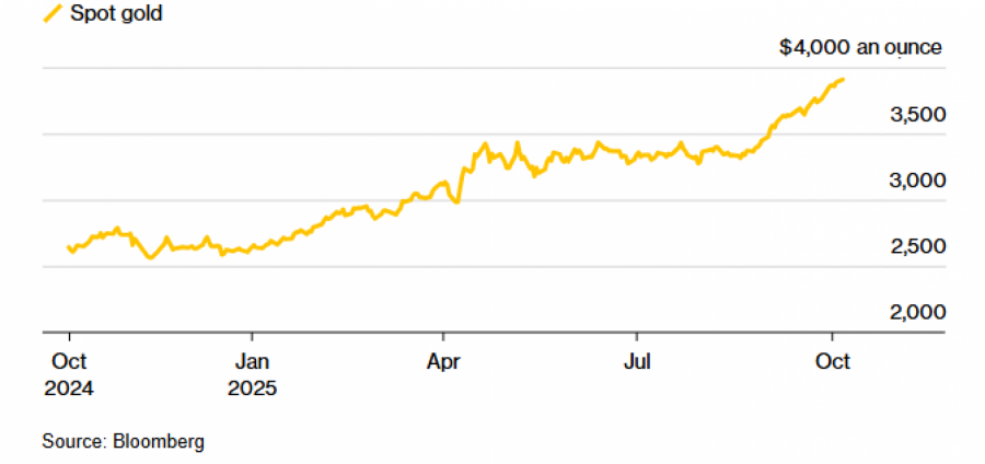 Цената на златото достигна рекордно ниво, приближувајќи се до 4.000 долари за унца, поттикната од очекувањата за намалување на каматните стапки во САД и продолженото затворање на федералната влада.