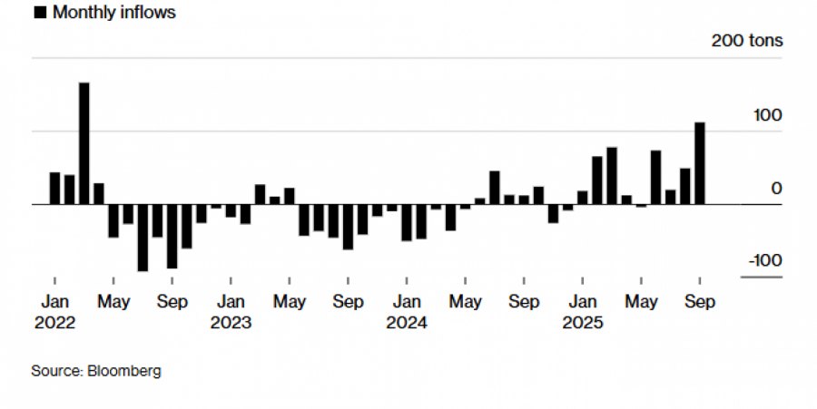 Растот на цената на златото доби уште поголема динамика, бидејќи инвеститорите бараат заштита од можни пазарни шокови поради застојот во финансирањето на федералната влада во Вашингтон. Почетокот на циклусот на монетарно олабавување од страна на Федералните резерви исто така претставува поттик за златото, кое не носи камата. Како резултат на тоа, инвеститорите масовно вложуваат во фондови што се тргуваат на берза (ЕТФ), а златните ЕТФ-ови во септември забележале најголем месечен прилив во последните три години.