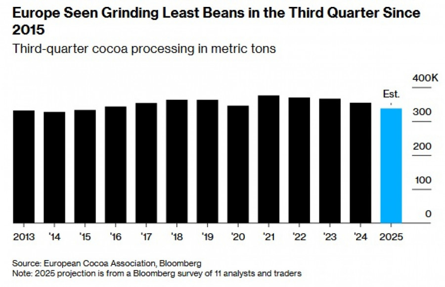 Мелењето какао - процесот на претворање на зрната во путер и прав за чоколадо и други слатки - во Европа, најголемиот потрошувач, во третиот квартал падна на веројатно најниско ниво во најмалку една деценија, според просекот на 11 аналитичари и трговци анкетирани од „Блумберг“.
