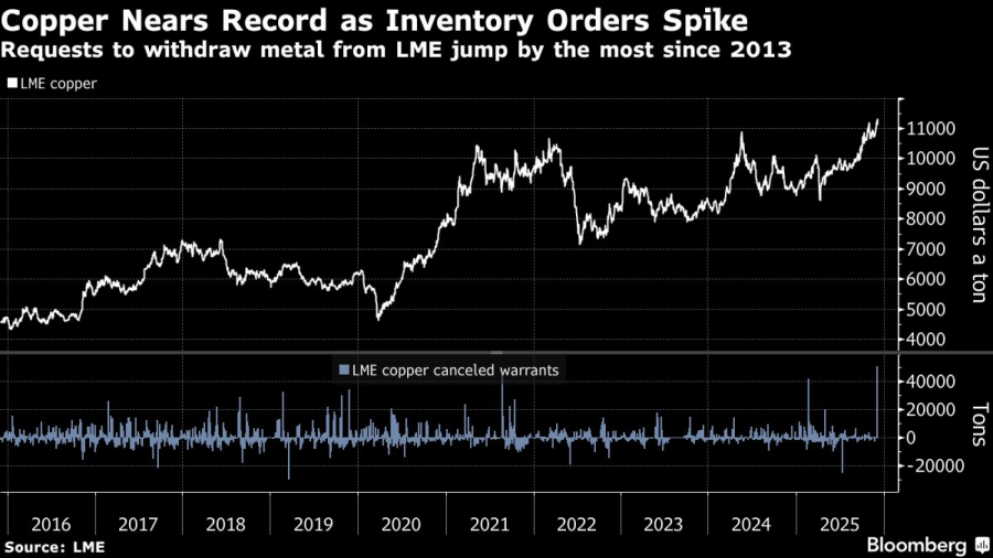 Цената на бакарот порасна и металот се тргува малку под рекордно високо ниво откако барањата за повлекување залихи од магацините на Лондонската стокова берза се зголемија најмногу од 2013 година.
