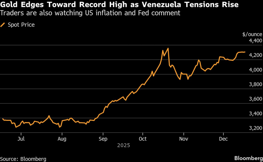 Златото не е далеку од рекордно високото ниво над 4.381 долар за унца, постигнато во октомври. Вредноста на благородниот метал оваа година скокна за околу две третини и е на добар пат да оствари најдобри годишни перформанси од 1979 година. Силниот раст е поттикнат од зголеменото купување од страна на централните банки, како и од поширокото повлекување на инвеститорите од државниот долг и клучните валути. Геополитичките тензии исто така ја зголемија неговата привлечност како засолниште.