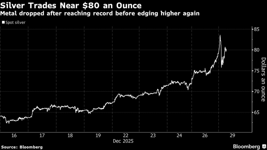 Среброто надмина 80 долари за унца, што е рекордно високо ценовно ниво, продолжувајќи го со тоа големиот раст на крајот од годината поттикнат од шпекулативни тргувања и постојано несовпаѓање меѓу понудата и побарувачката.