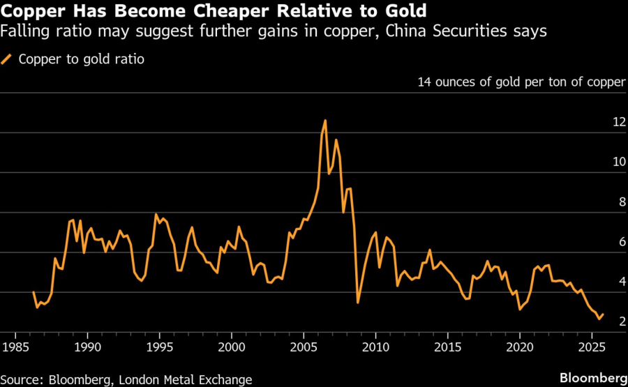 Количината на злато потребна за купување на еден тон бакар падна на рекордно ниско ниво, а двигателите зад растот на цената на златните прачки оваа година ќе го поттикнат бакарот во 2026 година, напишаа аналитичарите на компанијата „Чајна секјурититис“ (China Securities Co.), предводени од Џоу Џунжи. Како оптимисти за црвениот метал тие ги посочија олеснувањето на монетарната политика од страна на Федералните резерви на САД, бумот во технолошките индустрии и преобликувањето на глобалните синџири на снабдување поради американските царини.