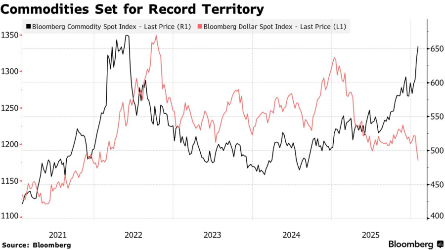 Рекордниот раст на суровините доби нов замав, откако златото, бакарот и среброто достигнаа историски рекорди, поттикнати од послабиот долар и зголемените геополитички тензии.