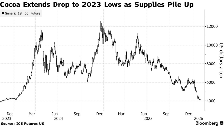 Фјучерсите за какао го продолжија падот на најниско ниво од ноември 2023 година, бидејќи врвните производители се борат да најдат доволно купувачи за своето производство.