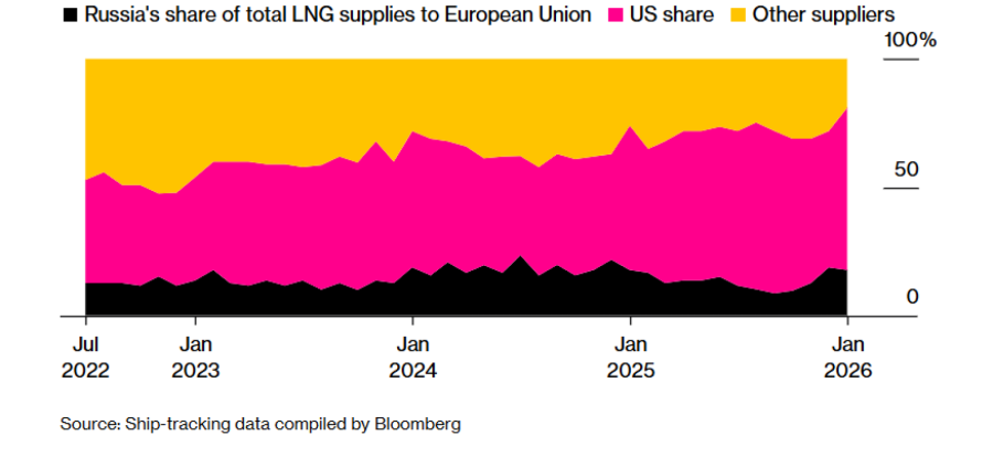 Европската Унија во јануари обезбедила повеќе од 80 отсто од течниот природен гас од САД и од Русија, покажуваат податоците за следење бродови собрани од „Блумберг“. Тоа претставува остар пресврт во однос на пред четири години, кога другите доставувачи учествуваа со околу половина од вкупните количества, за време на енергетската криза што следуваше по руската инвазија на Украина.
