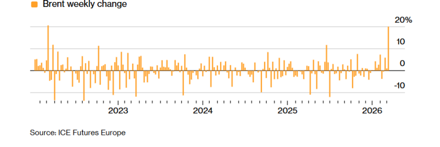 Глобалниот бенчмарк порасна за дури 5,7 отсто, додека американската нафта Вест Тексас надмина 85 долари за барел првпат од април 2024 година. Фјучерсите оваа недела се повисоки за повеќе од една петтина.