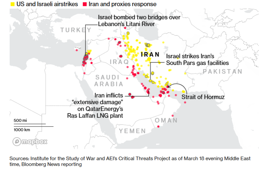 Индустрискиот комплекс Рас Лафан во Катар, каде што се наоѓа најголемата фабрика за извоз на течен природен гас во светот, претрпе „големи оштетувања“ по ракетен напад, додека последователен удар предизвикал пожар, соопштија локалните власти. Гасното поле Јужен Парс е важно за снабдување на домашниот пазар, како и за соседните Ирак и Турција. Поврзани нафтени и петрохемиски капацитети беа погодени и во Асалује во Исламската Република.
