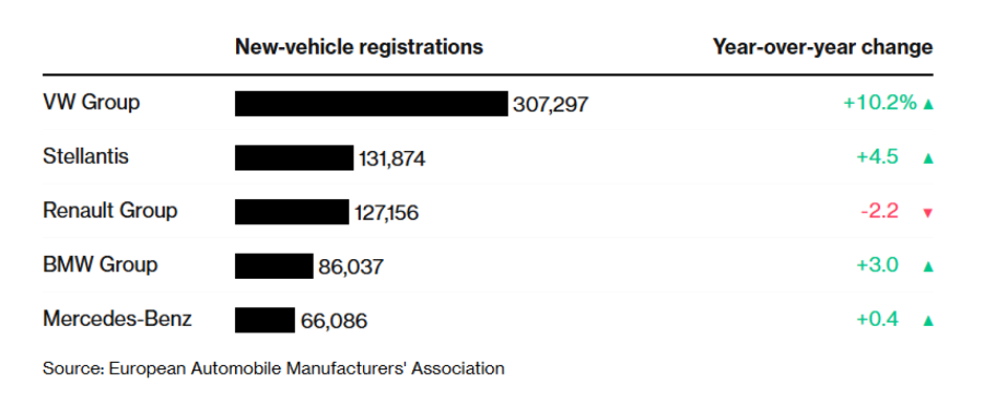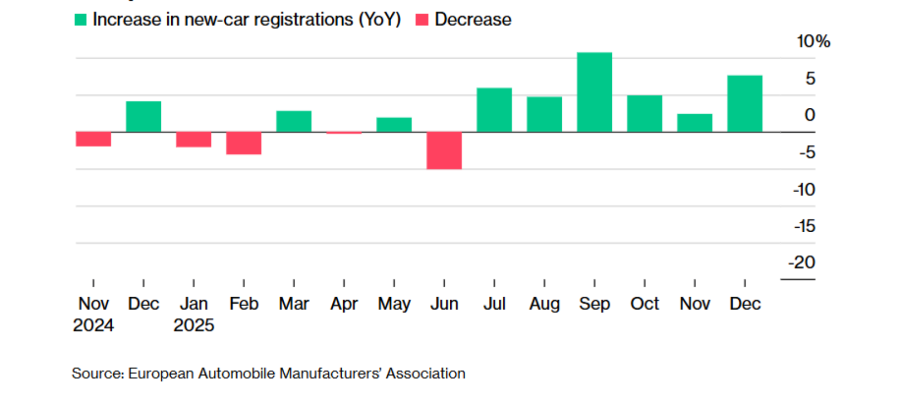Регистрациите на нови возила се зголемиле за 2,4 отсто, на 13,3 милиони единици, по уште еден раст во декември, соопшти во вторник Европската асоцијација на производители на автомобили. Иако тоа е добра вест за индустријата погодена од царини и растечка конкуренција, продажбата и понатаму е за околу 15 отсто под нивото пред пандемијата.