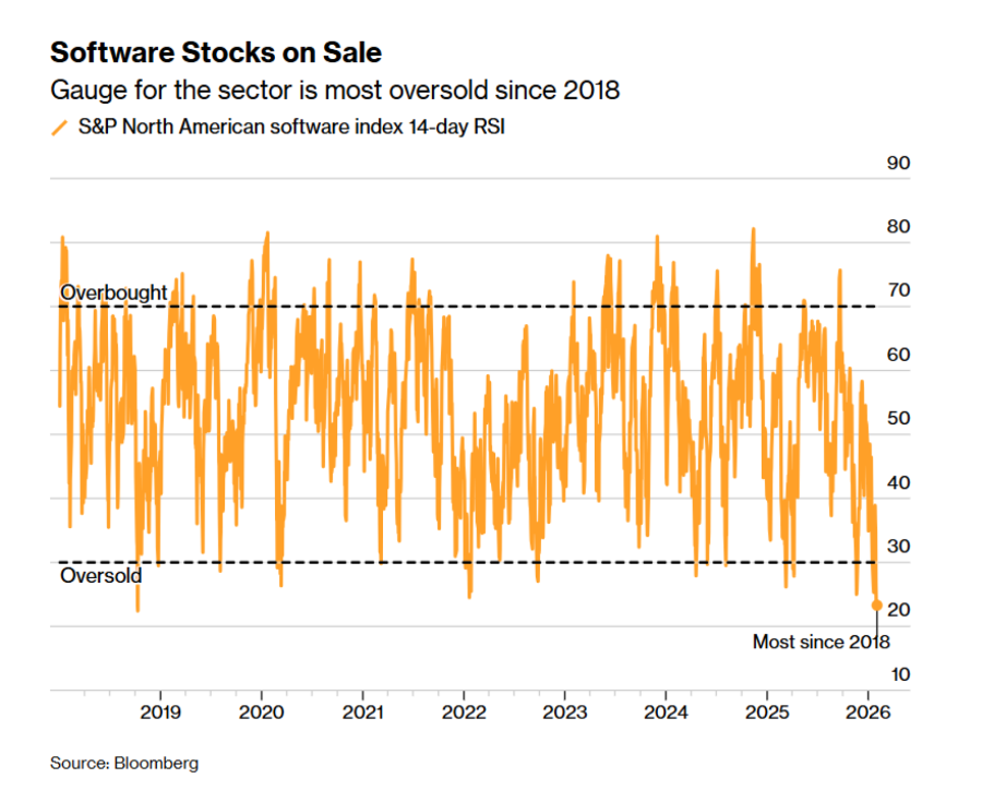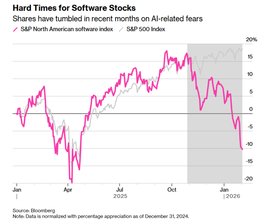 Ризиците за софтверската индустрија се натрупуваат со месеци, а јануарското лансирање на алатката „Клауд коворк“ (Claude Cowork) од „Антропик“ ги засили стравовите од нарушувања. Акциите на видео-игри исто така беа погодени минатата недела, откако „Алфабет“ (Alphabet Inc.) започна со проектот „Џини“ (Genie), кој може да создава светови што потполно те вовлекуваат со текст или слики. Севкупно, индексот S&P North American Software е во тринеделна серија на пад, што доведе до пад од 15 отсто во јануари - најголем месечен пад од октомври 2008 година.