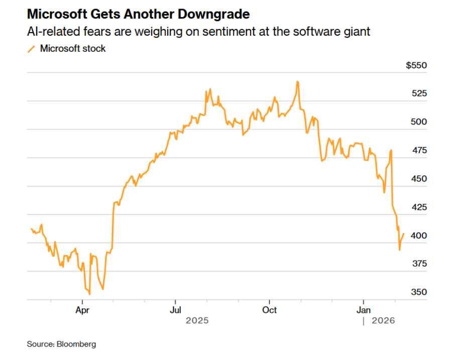 Акциите на „Мајкрософт“ беа потценети по втор пат за помалку од една недела, бидејќи „Волстрит“ станува сè повнимателен околу потенцијалните нарушувања со кои се соочуваат софтверските компании поради вештачката интелигенција.