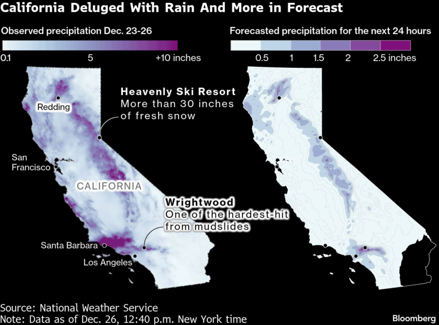 Во планинските области на Калифорнија, метеоролошката служба предупреди на „услови блиску до бела завеса“ што ќе го направат патувањето опасно и веројатно ќе предизвикаат доцнења и затворања на патишта.