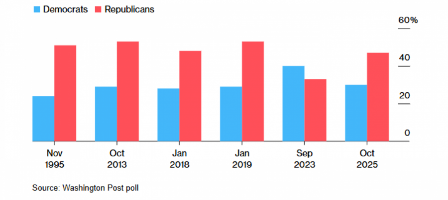 Анкета на „Вашингтон пост“ покажа дека повеќето гласачи ги обвинуваат Трамп и Републиканската партија за блокадата на владата отколку што сметаат дека се виновни демократите – со разлика од 17 проценти. Независните гласачи во голема мера застануваат на страната на демократите, а самите демократи се и посложни: само 67 отсто од републиканците ги обвинуваат демократите за блокадата, додека 87 отсто од демократите ја обвинуваат Републиканската партија.