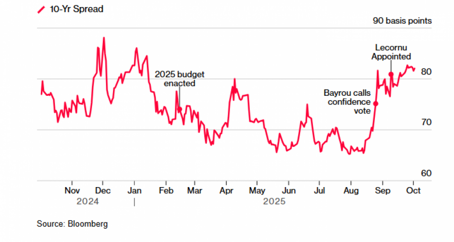 Разликата во приносот меѓу француските и германските државни обврзници – клучен показател за фискалниот ризик – се прошири на околу 81 базичен поен, од најниско 65 во август, пред Баиру да објави дека ќе ризикува гласање за доверба во Националното собрание.