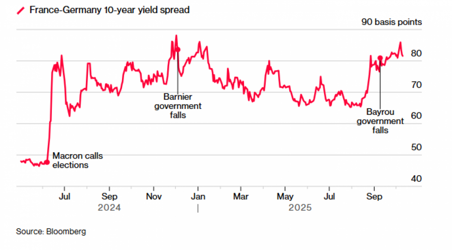 Нов можен пад на владата најверојатно би предизвикал нови продажби на француските пазари. Разликата меѓу приносите на десетгодишните француски и германски обврзници – клучен показател за ризик – веќе порасна на повеќе од 80 базични поени, од 65 во август и 43 пред Макрон да ги распише вонредните избори минатата година, со кои парламентот се распадна на непомирливи малцински блокови.