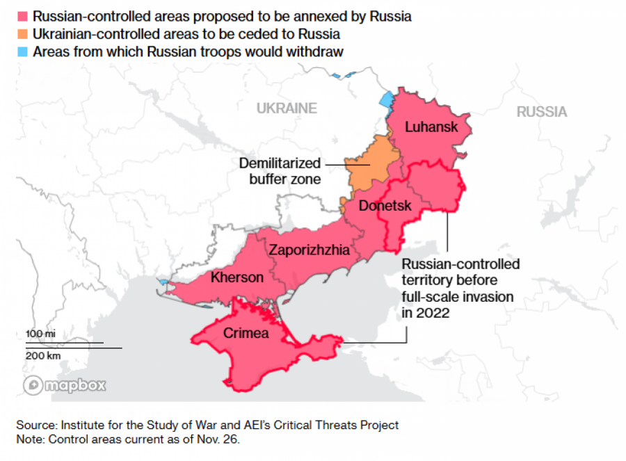 Американски и руски официјални лица во ноември претставија мировен предлог-договор според кој Украина би се откажала од големи делови од својата територија во корист на Русија, би се откажала од какви било надежи за членство во воениот сојуз НАТО и би ги намалила своите вооружени сили. Планот од 28 точки беше пречекан со негодување од владата во Киев и нејзините европски сојузници, кои изјавија дека тој би ги оставил изложени на идна руска агресија не само Украина туку и целиот континент.