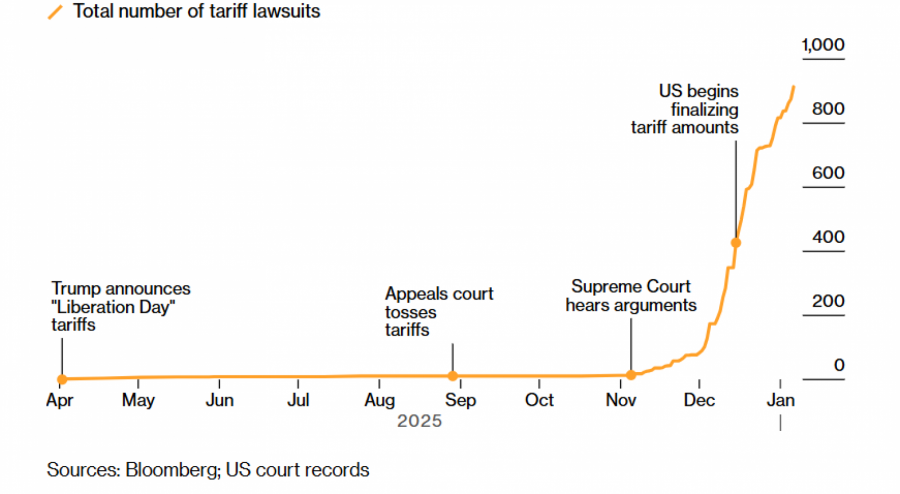 По повеќе поминати месеци, во последните недели бран компании од целиот глобален економски спектар поднесоа тужби, откако судиите на расправата на 5 ноември беа скептични кон клучната трговска политика на Трамп. Судските записи покажуваат дека во правната битка сега се вклучени повеќе од 1.000 корпоративни субјекти, што најавува невидена правна пресметка околу тоа што следува доколку администрацијата ја загуби постапката.