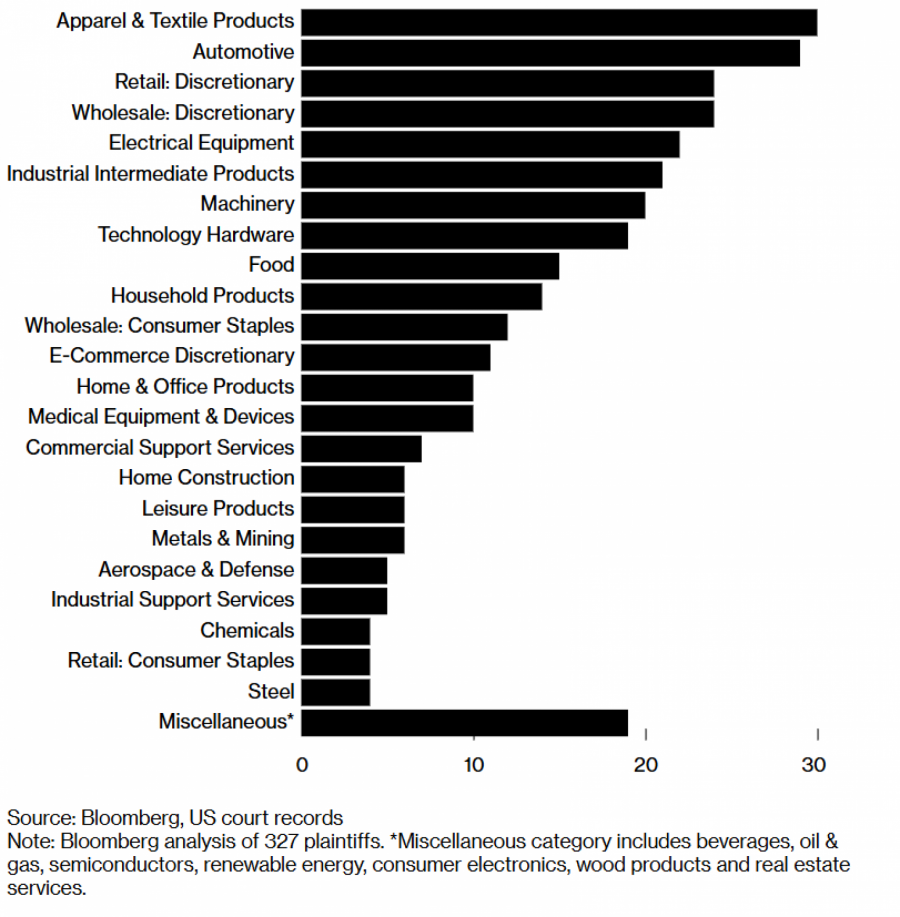 Производителите и дистрибутерите на облека и текстил, како и автомобилската индустрија, доминираат меѓу поднесените тужби, заедно со компании што произведуваат индустриска и електрична опрема. Тужби поднесоа и трговци на мало и големо што продаваат сè – од опрема за риболов на мраз и шминка до декорација за домот и компјутерски делови.