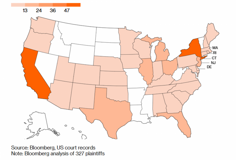 Компаниите што бараат поврат на средства речиси целосно се со седиште во САД. На 327 компании анализирани од „Блумберг“ седиштата им се распоредени низ речиси триесетина сојузни држави, при што Њујорк и Калифорнија доминираат во судските предмети. Дополнителни десетина тужители се со седиште во странство, во Канада, Сингапур и неколку европски земји.