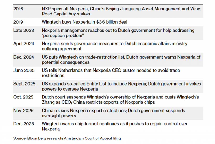 Откако холандски суд интервенираше во сопственичката структура на „Некспирија“ во октомври, спорот почна да создава ризици за автомобилското производство во Европа и пошироко. На едната страна е јадрото на компанијата, кое се наоѓа под управа на судски назначени довереници во Холандија; на другата страна е клучен производствен капацитет поврзан со поранешниот сопственик „Вингтек“ (Wingtech Technology Co.), електронска компанија во која околу 30 отсто од сопственоста е во рацете на субјекти блиски до кинеската држава.