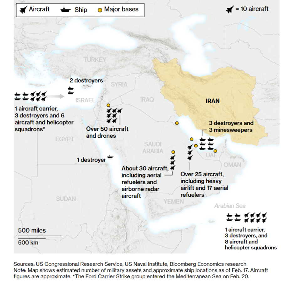 Американската војска во меѓувреме концентрира значителни сили на Блискиот Исток – најверојатно најголемо американско распоредување во регионот од инвазијата на Ирак во 2003 година – вклучувајќи два носачи на авиони, борбени авиони и авиони-цистерни за дополнување гориво. Трамп во петокот изјави дека „разгледува“ ограничени напади врз Иран и дека Техеран има околу две недели да постигне договор околу својата нуклеарна програма.