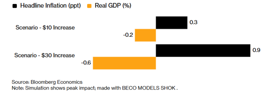 Како општо правило, траен шок од 10 долари по барел на нафтата би ја зголемил инфлацијата во еврозоната за 0,4 процентни поени, проценува „Морган Стенли“ (Morgan Stanley). Во меѓувреме економскиот раст би бил понизок за 0,15 процентни поени.