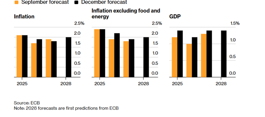 Последните проекции на Европската централна банка предвидуваат инфлацијата да остане под целта до 2028 година, при што растот би се забрзал на 1,4 отсто следната година од 1,2 отсто во 2026 година.