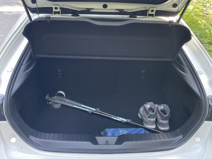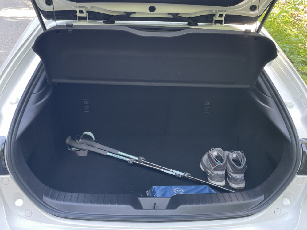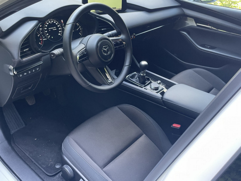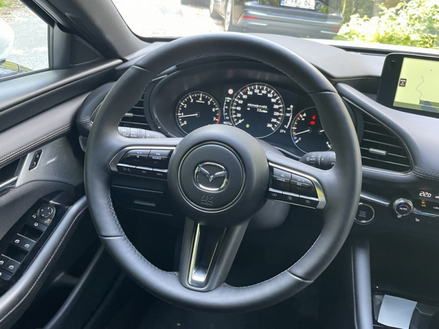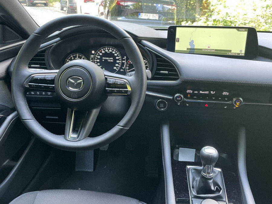 Работниот простор на возачот е внимателно одмерен, а кабината не е изложбен салон на мултифункционални екрани. Покрај инструментите, во средишниот дел е поставен правоаголен екран со дијагонала од скромни 25 сантиметри, со кој се управува преку препознатливото ротирачко копче на „Мазда“ на централната конзола. Под него се наоѓа уште помал и потесен дисплеј за функциите на автоматската двозонска клима. И тука, всушност, завршува приказната за дигитализацијата.