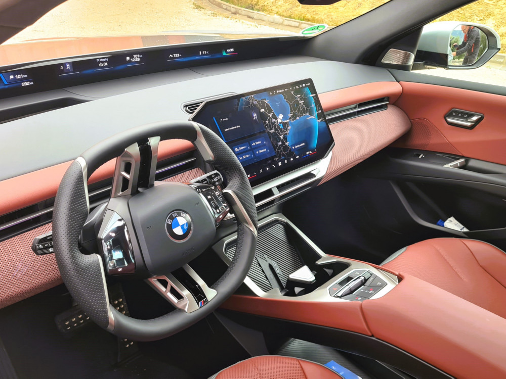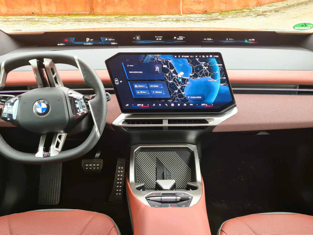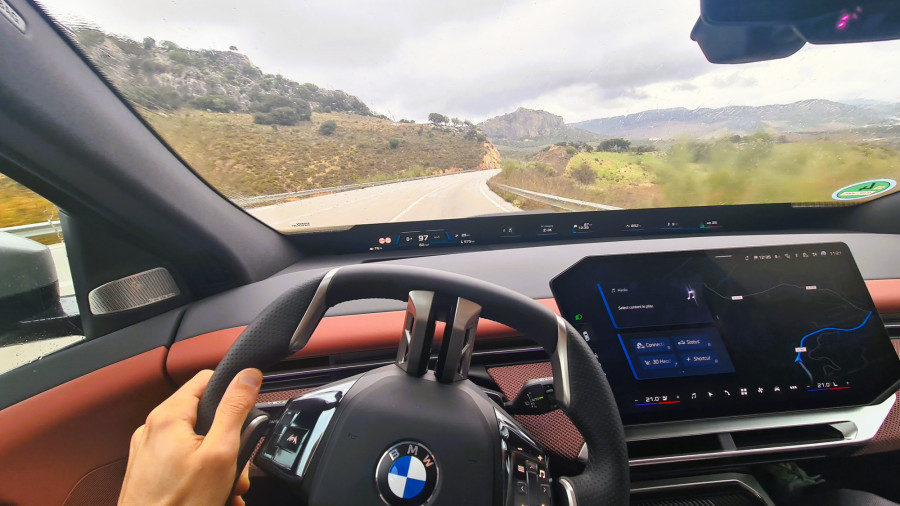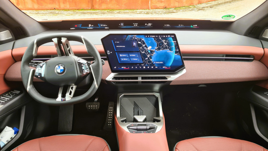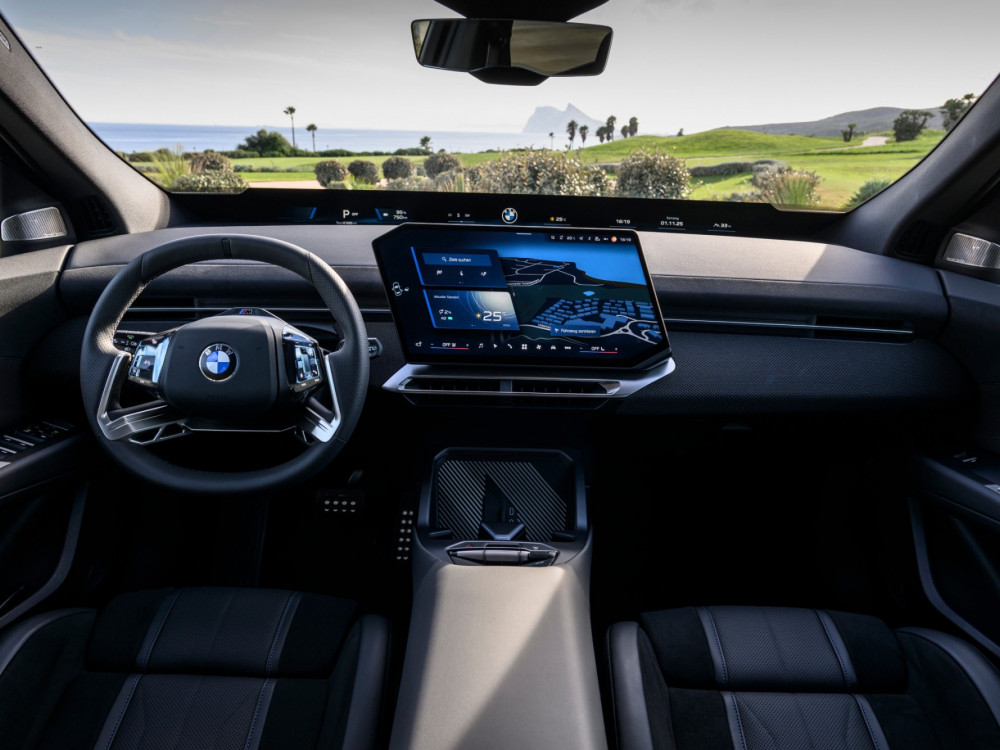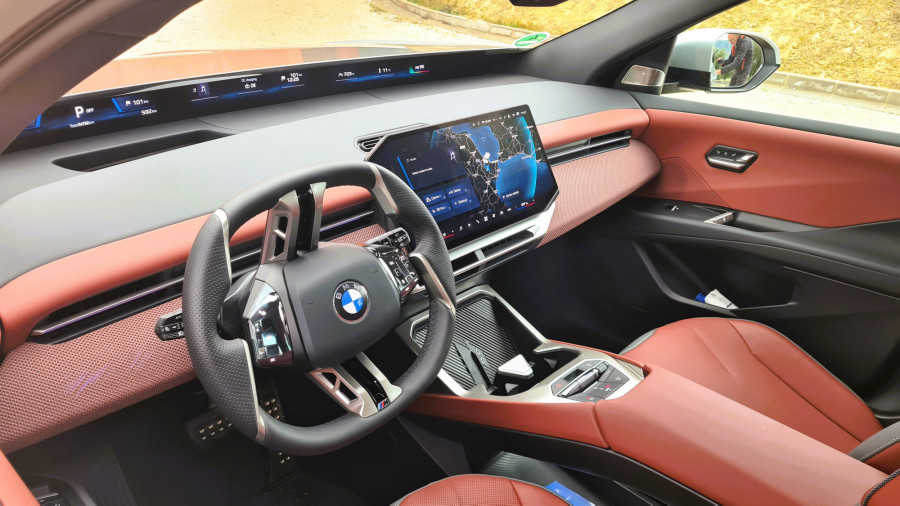 Контролната табла е ниска, така што панорамскиот екран под шофершајбната не го попречува погледот. Над него, капакот на моторот е сè уште видлив. По првите неколку метри, кога го напуштив хотелот, ми беше јасно дека iX3 е дизајниран за удобност… или барем така мислев. Пред тоа се возевме до хотелот со поголемиот BMW iX. Во градско возење, по дупки и при брзини со забавувачи, iX3 е многу споредлив. Убаво и тивко ги апсорбира нерамнините. Воланот, и покрај неговата доста необична форма, убаво се вклопува во дланките. Копчињата лево се наменети за помош, додека оние десно се користат за навигација низ менијата.