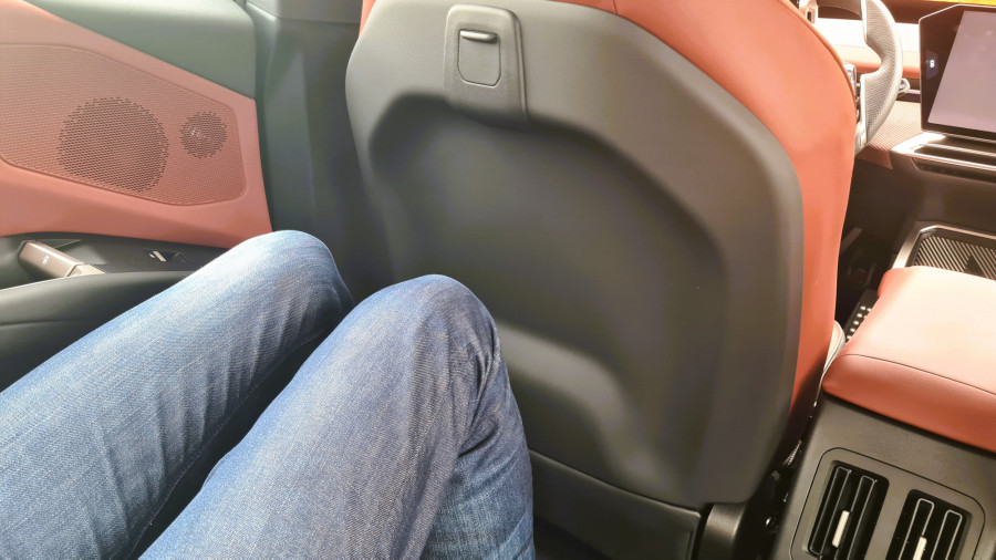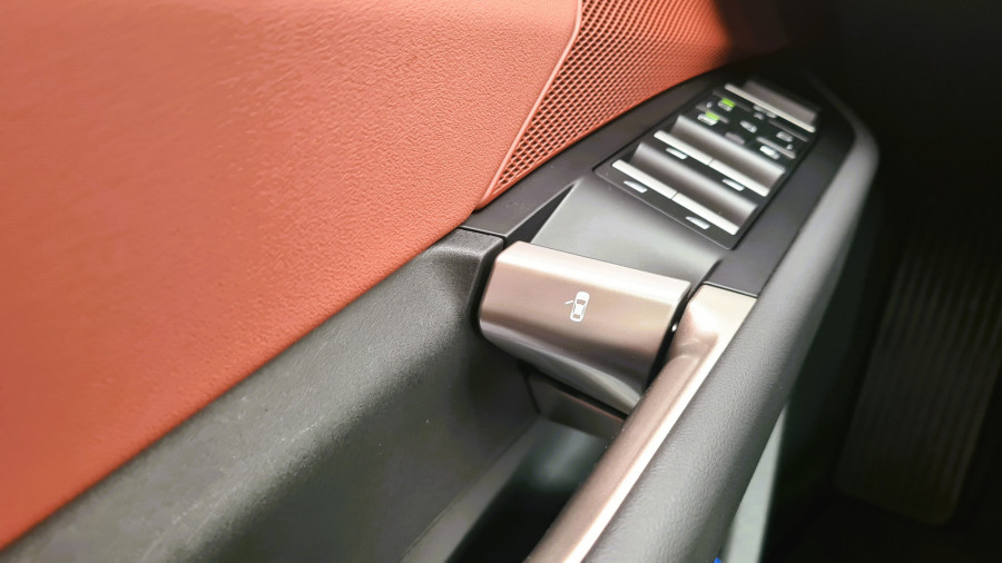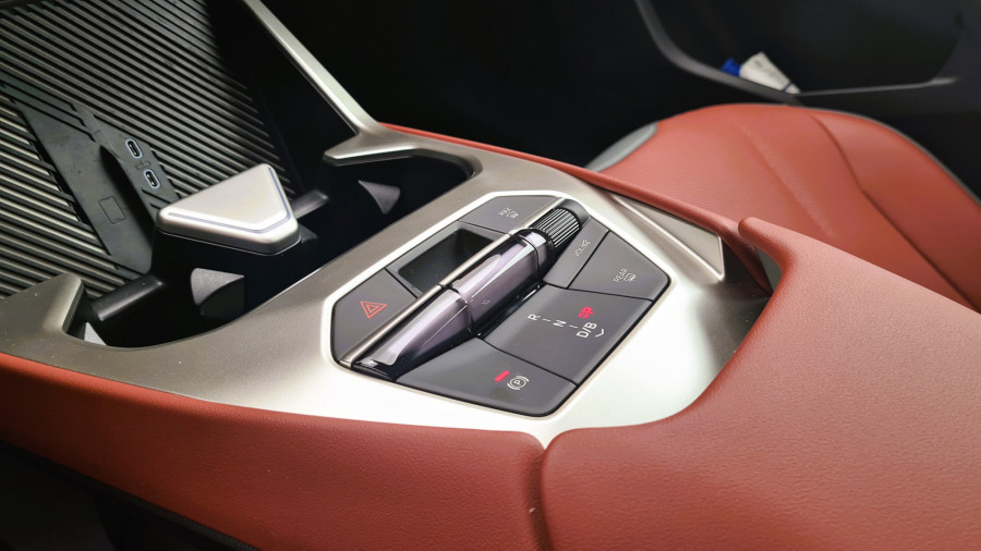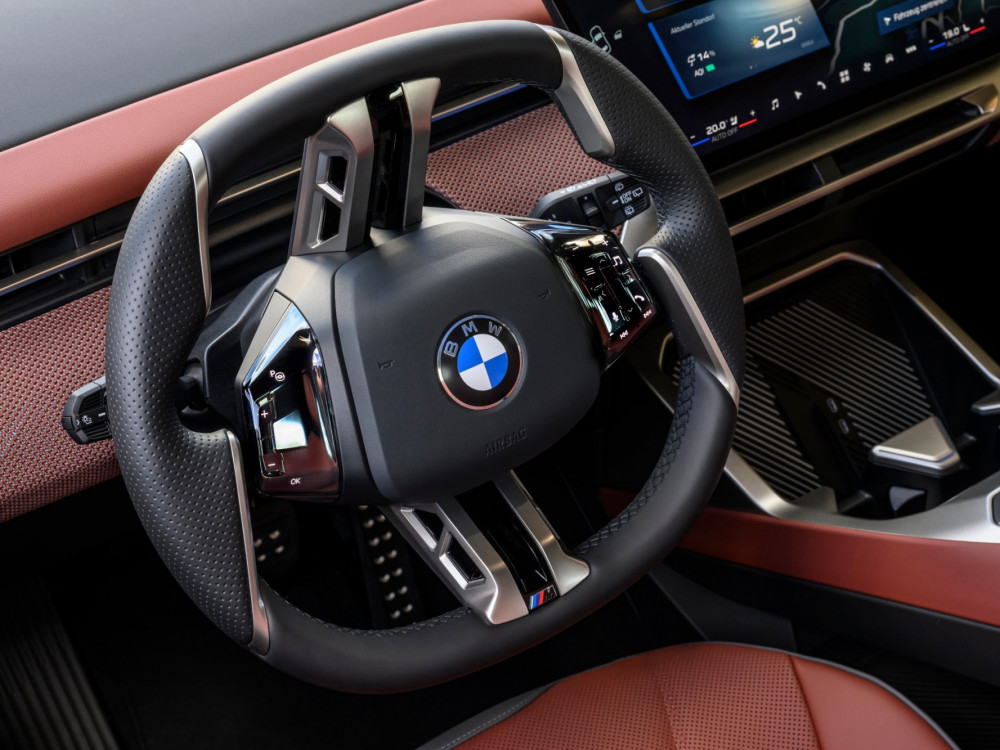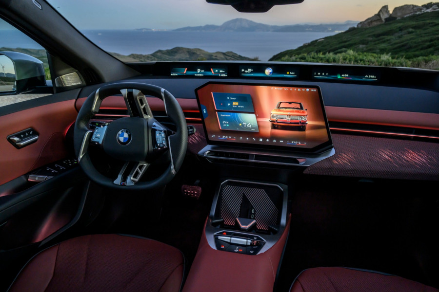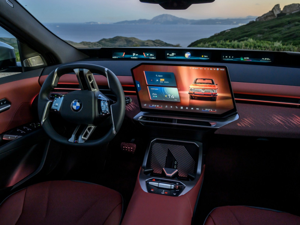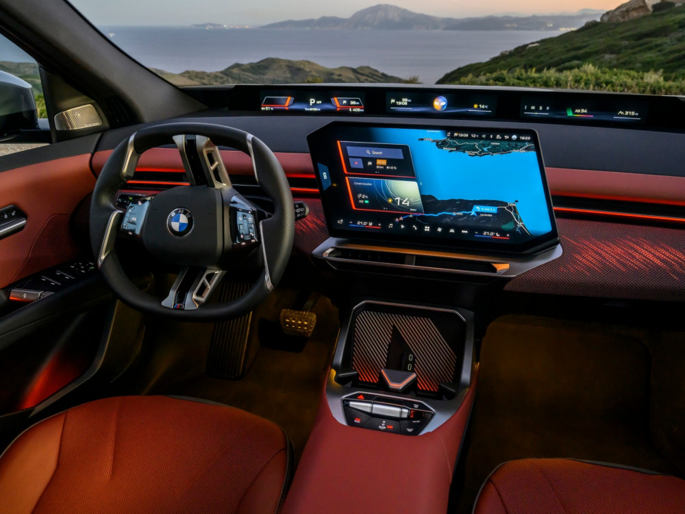 Контролната табла е ниска, така што панорамскиот екран под шофершајбната не го попречува погледот. Над него, капакот на моторот е сè уште видлив. По првите неколку метри, кога го напуштив хотелот, ми беше јасно дека iX3 е дизајниран за удобност… или барем така мислев. Пред тоа се возевме до хотелот со поголемиот BMW iX. Во градско возење, по дупки и при брзини со забавувачи, iX3 е многу споредлив. Убаво и тивко ги апсорбира нерамнините. Воланот, и покрај неговата доста необична форма, убаво се вклопува во дланките. Копчињата лево се наменети за помош, додека оние десно се користат за навигација низ менијата.