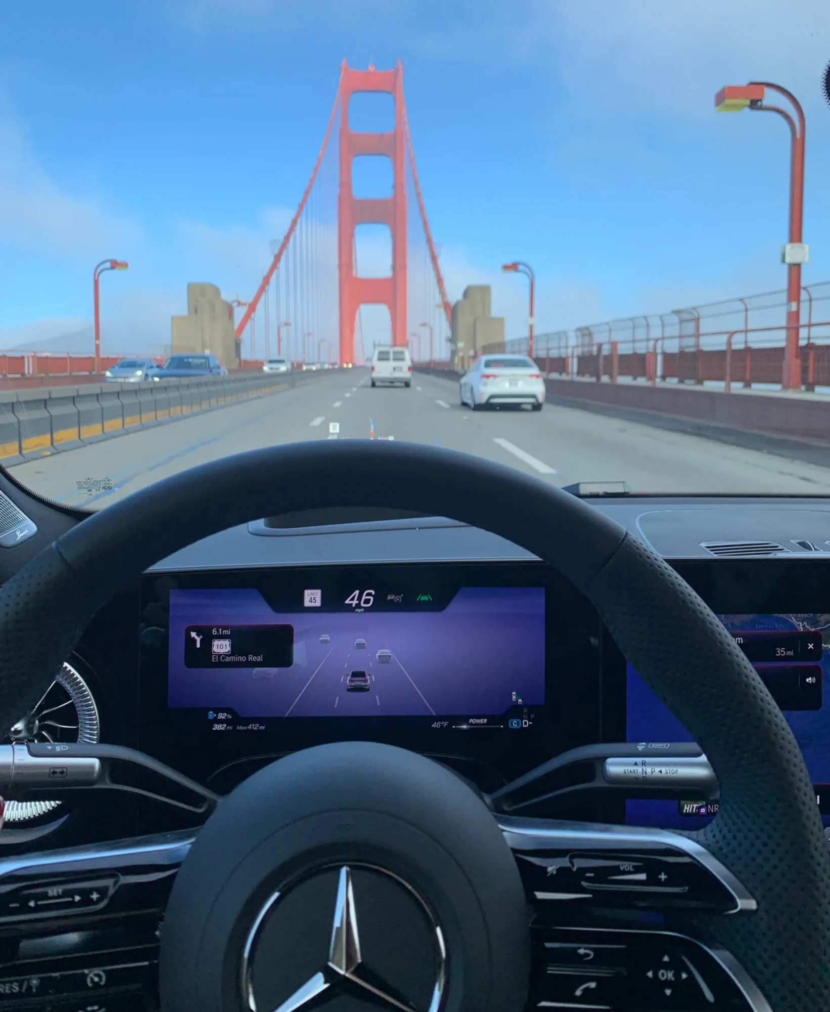 Но, како е чувството да се возиш во патнички автомобил со кој целосно управува вештачка интелигенција? Тоа го доживеав во декември во Сан Франциско, заедно со Џо Тејлор, системски инженер во „Мерцедес-Бенц“, во новиот модел „Мерцедес-Бенц ЦЛА“, чија цена изнесува 47.250 долари. Тој автомобил го има најнапредниот ВИ-систем за возење кај патничките возила што во моментов е достапен во САД.