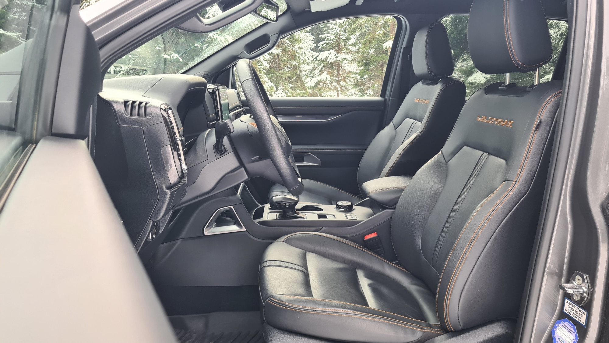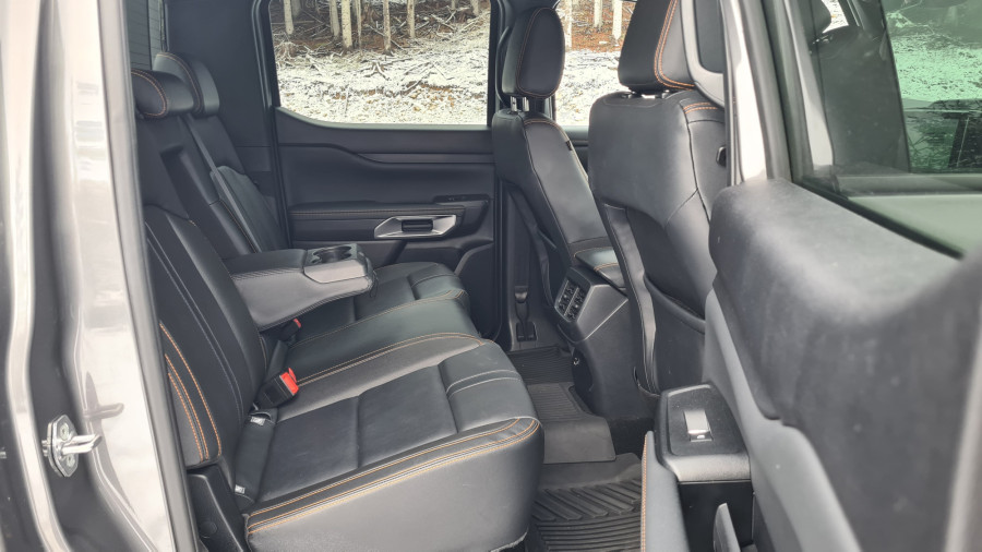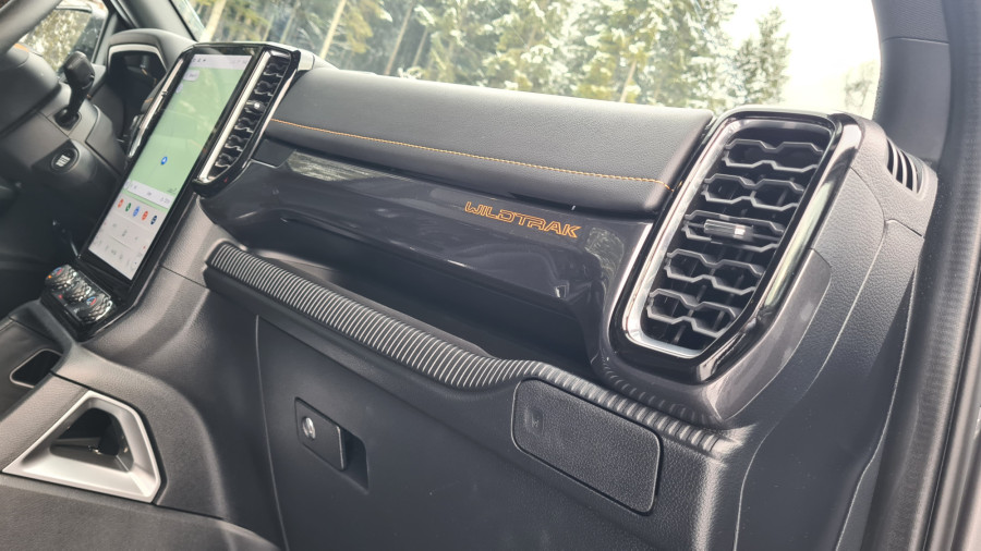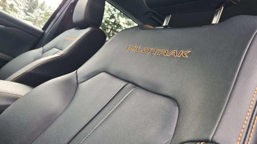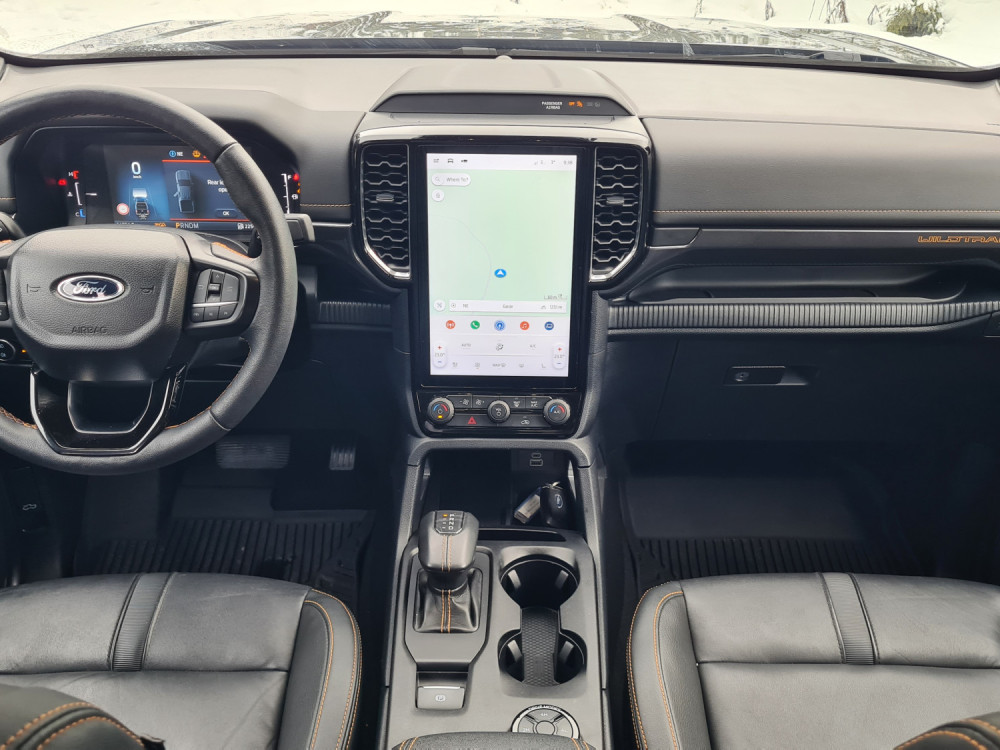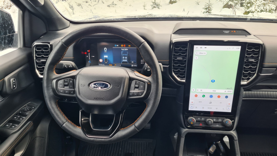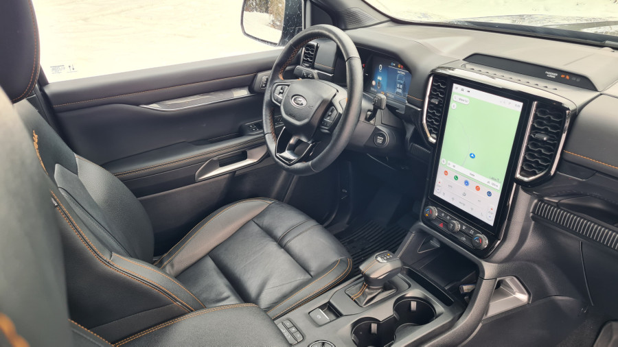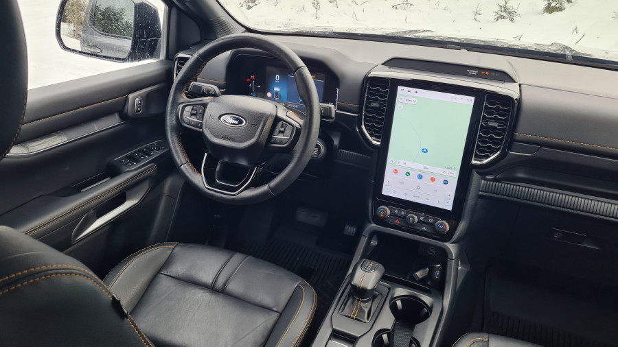 За да се качам внатре, си помогнав користејќи ја големата рачка на А-столбот и скалата. Во претходната генерација имав чувство дека седам во автомобил, во новата седиш поткренато. Чувството е веќе некако камионски, па затоа терминот полутоварен е сосема соодветен. Веднаш ве воодушевуваат високата позиција зад воланот и бескрајниот поглед. Седењето високо обично не ми е важно, претпочитам да седам пониско. Во „ренџер“ седиш над сите други. Во секоја гаража несвесно ја наведнував главата.
