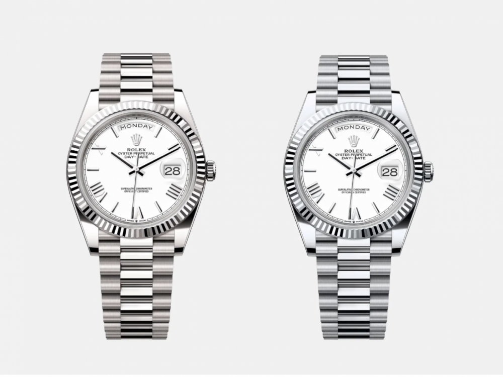 На левата страна е „ролекс деј-дејт“ (Rolex Day-Date) од бело злато, со дијаметар од 40 милиметри, модел 228239, чија малопродажна цена е 51.600 долари. На десната страна е „ролекс деј-дејт“ од платина, исто така со дијаметар од 40 мм, модел 228236, со малопродажна цена од 68.800 долари.