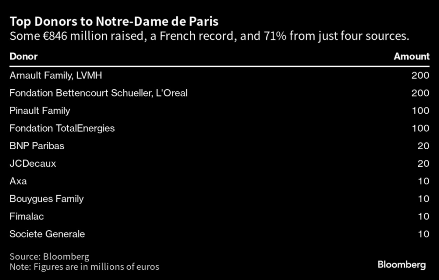 Бернард Арно, извршен директор на луксузниот конгломерат ЛВМХ (LVMH), донира 200 милиони евра, што е износ што го издвоиле и фондацијата „Бетенкур Шулер“, односно семејството што стои зад „Лореал“ (L'Oréal). Франсоа Пино, основачот на „Керинг“ (Kering), и Патрик Пујане, извршен директор на „Тотал“ (Total), донираа по 100 милиони евра.