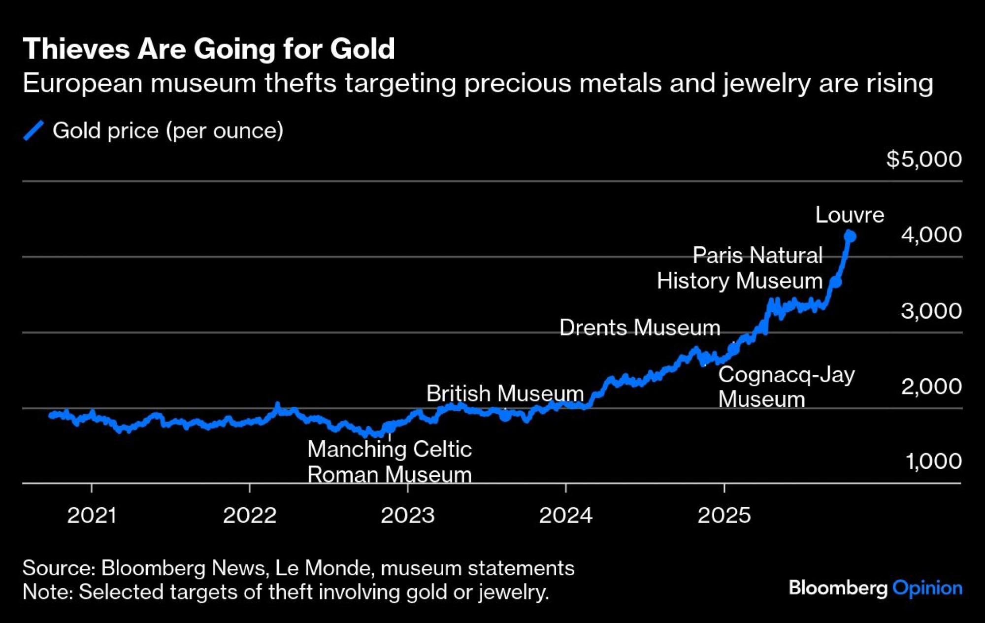 Графиконот погоре покажува како музејските кражби стануваат сè посмели, додека цената на златото се удвои за само една година и порасна десеткратно во текот на две децении. Мноштвото инвеститори кои бегаат од некогаш сигурните вложувања, како што се државните обврзници, ја прави физичката имотна вредност што може да се чува во сефови исклучително привлечна.