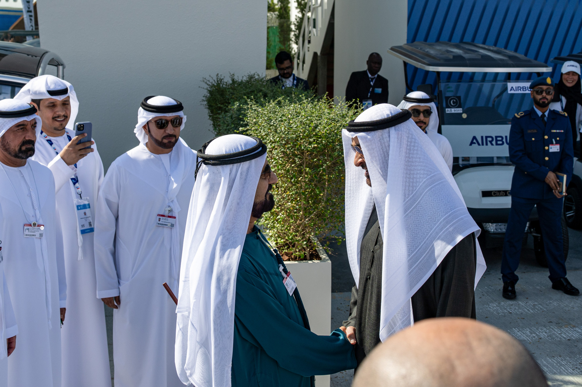 Шеикот Мохамед бин Зајед ал Нахјан, претседател на Обединетите Арапски Емирати, десно, се ракува со шеикот Мохамед бин Рашид ал Мактум, владетел на Дубаи, на саемот за воздухопловство во Дубаи во ноември.