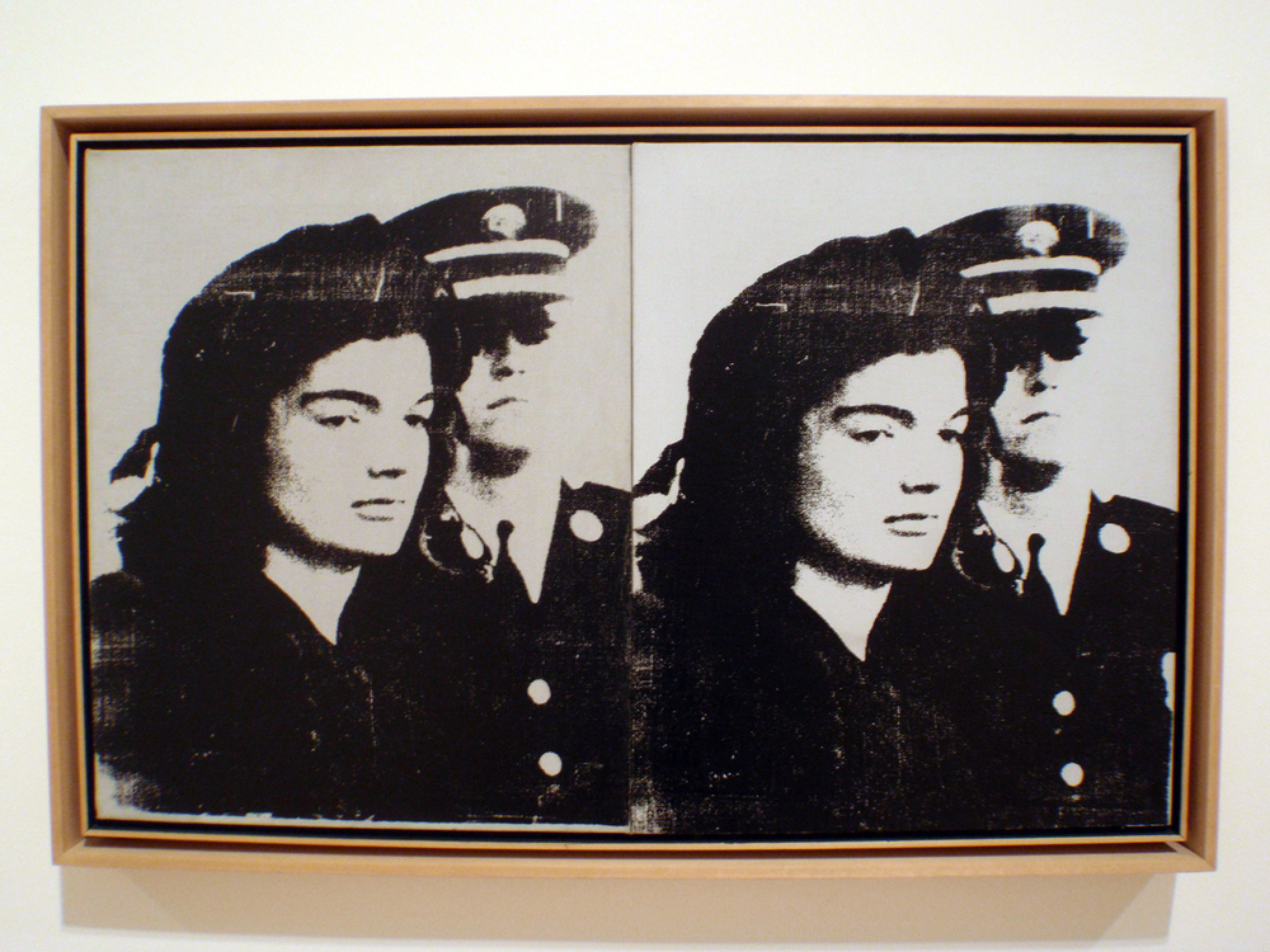 Иконската слика на тажната Џеки Кенеди како стои до полицаец, дело од Енди Ворхол, ситопечат во боја на платно | Depositphotos